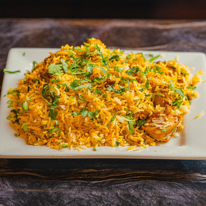 Basmati rice cooked with chicken and spiced and cilantro and dry onion.
